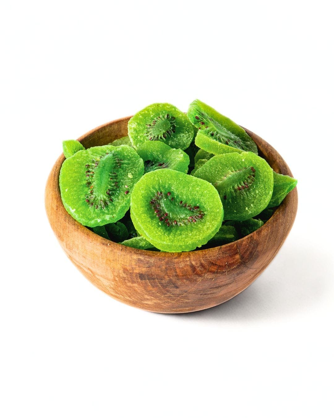 شرائح كيوي مجفف بطعم حلو مائل للحموضة، مثالية كوجبة خفيفة صحية أو لإضافة لمسة استوائية للحلويات والسلطات.