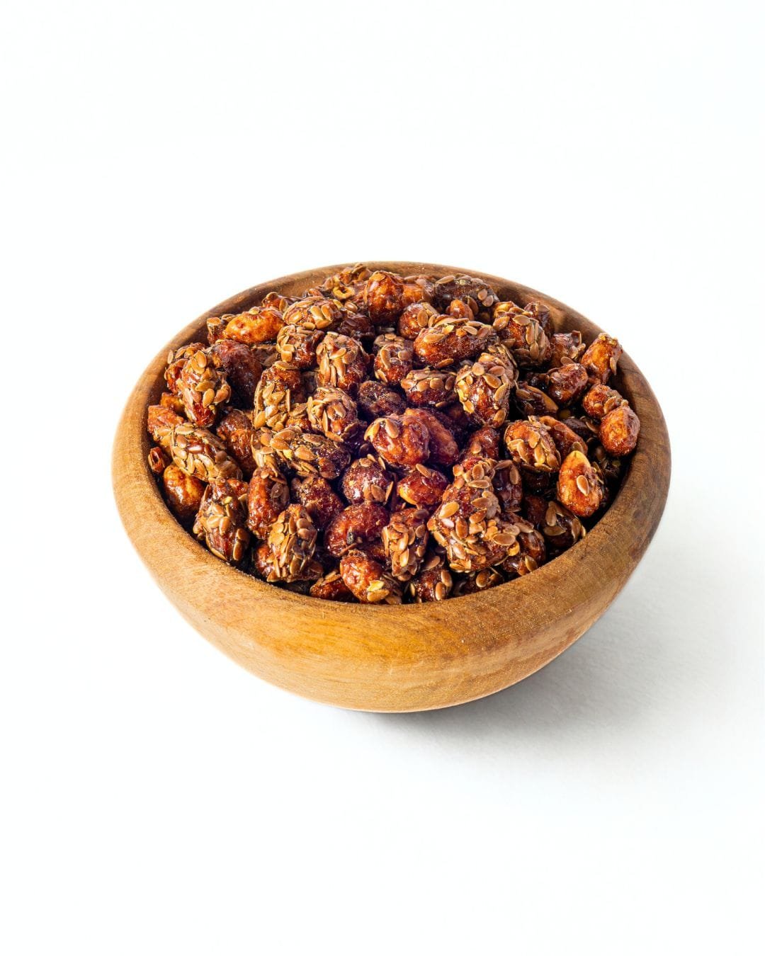 Cacahuètes grillées enrobées d’une couche croustillante de graines de lin, un snack savoureux et nutritif.